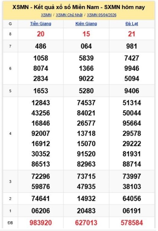 Kết quả xổ số miền Nam (KQXSMN) ngày 6/4/2026 được quay thưởng vào lúc 16h15 theo khung giờ cố định hằng ngày. Người chơi có thể theo dõi trực tiếp tại các đài hoặc tra cứu nhanh kết quả xổ số miền Nam hôm nay ngay sau khi quay số kết thúc. Đây là khu vực có tần suất mở thưởng liên tục, mỗi ngày từ 3-4 đài, đảm bảo công khai và minh bạch trong từng kỳ quay.