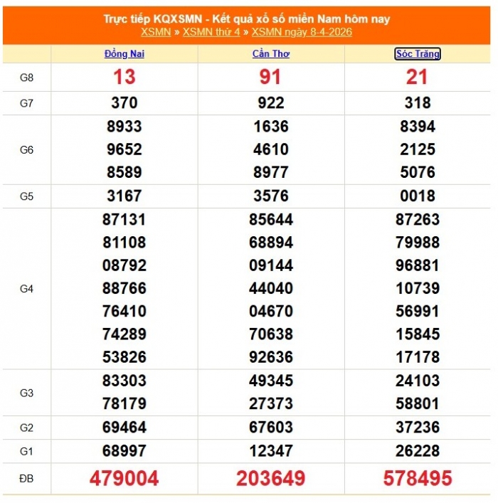 Kết quả xổ số miền Nam (KQXSMN) ngày 9/4/2026 được quay thưởng vào lúc 16h15 theo khung giờ cố định hằng ngày. Người chơi có thể theo dõi trực tiếp tại các đài hoặc tra cứu nhanh kết quả xổ số miền Nam hôm nay ngay sau khi quay số kết thúc. Đây là khu vực có tần suất mở thưởng liên tục, mỗi ngày từ 3-4 đài, đảm bảo công khai và minh bạch trong từng kỳ quay.