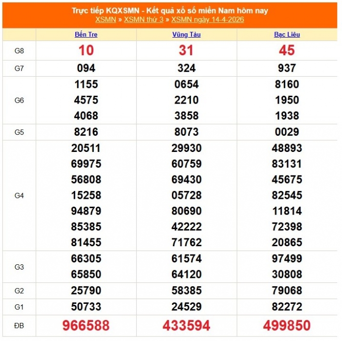 Kết quả xổ số miền Nam ngày 14/4/2026
