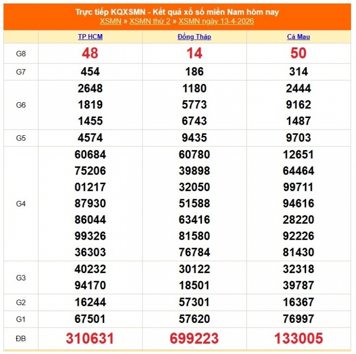 Kết quả xổ số miền Nam ngày 13/4/2026