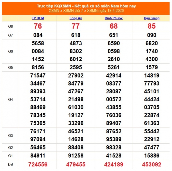 Kết quả xổ số miền Nam ngày 18/4/2026