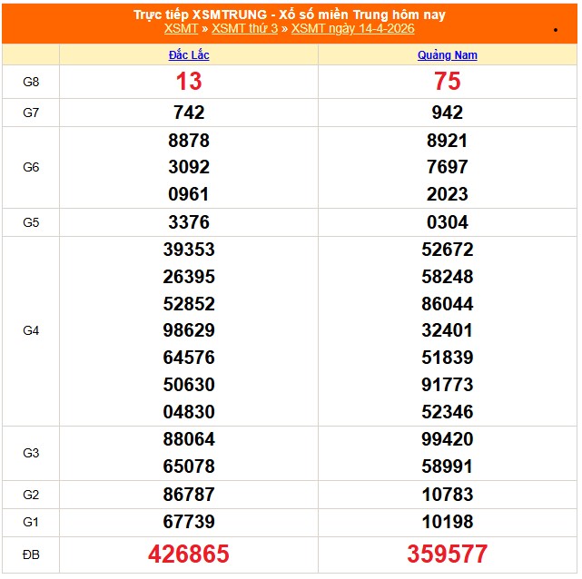 Kết quả xổ số miền Trung ngày 14/4/3/2026