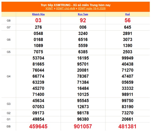 Kết quả xổ số miền Trung ngày 19/4/3/2026