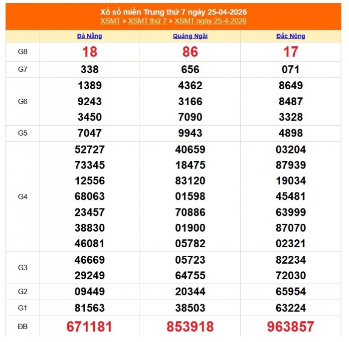 Kết quả xổ số miền Trung ngày 25/4/3/2026