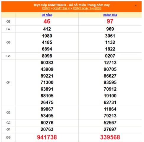 Cập nhật kết quả xổ số miền Trung hôm nay 4/4/2026 (XSMT) nhanh và chính xác nhất với 4 tỉnh thành: Đà Nẵng, Quảng Ngãi và Đắc Nông.