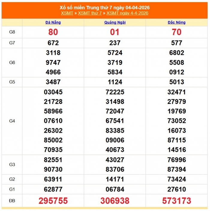 Cập nhật kết quả xổ số miền Trung hôm nay 5/4/2026 (XSMT) nhanh và chính xác nhất với 4 tỉnh thành: Đà Nẵng, Quảng Ngãi và Đắc Nông.