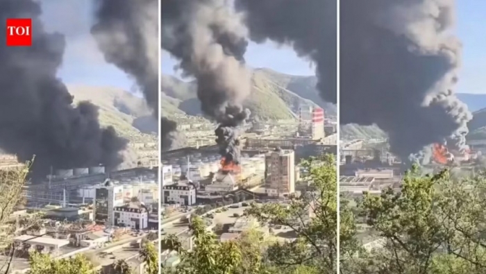 Cột khói bốc lên tại nhà máy lọc dầu ở thành phố Tuapse (Nga), sau cuộc tấn công bằng máy bay không người lái từ Ukraine, ngày 28/4. (Nguồn: Times of India)