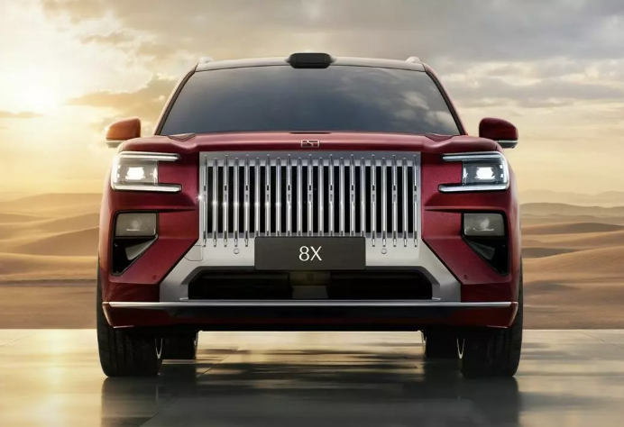 Ngoại hình Zeekr 8X gây ấn tượng mạnh với phong cách bề thế, cơ bắp và mang hơi hướng Porsche Cayenne. Phần đầu xe nổi bật với lưới tản nhiệt mạ bạc cỡ lớn kiểu Rolls-Royce, cụm đèn LED hình chữ C với hai dải đèn LED định vị ban ngày nằm ngang, kết hợp các đèn chiếu projector đặt phía dưới. Đèn pha được cấu thành từ 25.368 mặt cắt hình kim cương, tạo hiệu ứng ánh sáng cao cấp.