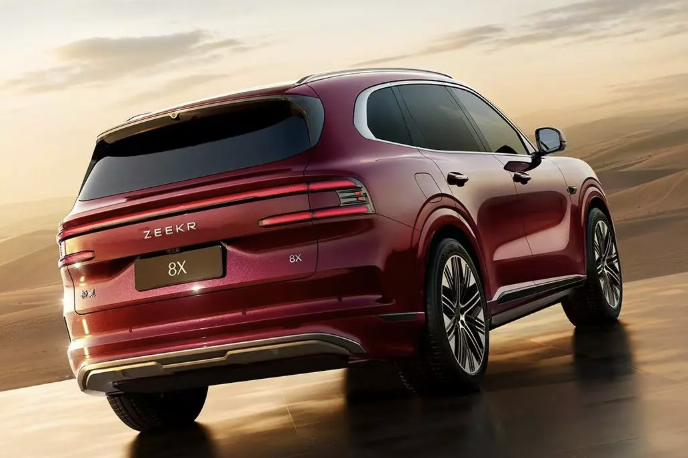 Phía sau, Zeekr 8X được trang bị cụm đèn hậu kéo dài nối liền hai bên, cấu thành từ 54.894 mặt cắt hình kim cương, sử dụng công nghệ ánh sáng đỏ siêu đậm bước sóng 630 nm. Cụm đèn hậu tích hợp dòng chữ Zeekr, trong khi hốc biển số được đặt ở vị trí cao, nhấn mạnh dáng vẻ đồ sộ của xe.