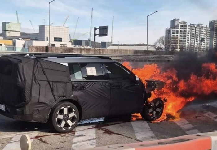 Một chiếc Hyundai Santa Fe bản facelift bất ngờ bốc cháy khi đang chạy thử, đặt ra nghi vấn nguyên nhân có thể đến từ hệ thống truyền động chạy điện mới.