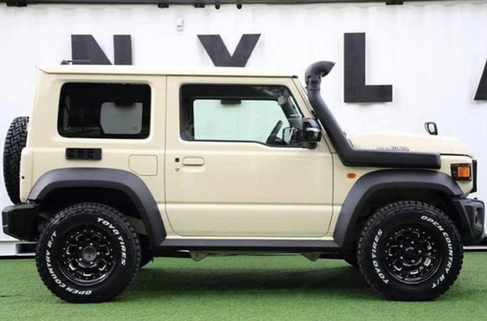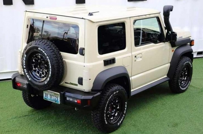 Thân xe về cơ bản vẫn giữ kết cấu nguyên bản của Jimny nhưng được điểm xuyết thêm các chi tiết mang tính trang trí như khe gió giả bên sườn, lưới giả phía sau và cụm đèn hậu mới. Đáng chú ý, xe còn được dán nhãn AdBlue giả trên nắp ca-pô, gợi nhớ tới các phiên bản máy dầu của Land Cruiser, dù thực tế Jimny chỉ sử dụng động cơ xăng.