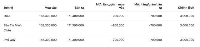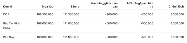 Trong khi đó, Bảo Tín Minh Châu và Phú Quý điều chỉnh giảm sâu hơn, khoảng 500.000 đồng/lượng, đưa giá về quanh 168 – 171 triệu đồng/lượng. Chênh lệch mua – bán tiếp tục neo ở mức cao, khoảng 3 triệu đồng/lượng.