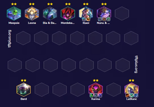 Ưu tiên fast 8, sau đó roll tìm Leblanc làm chủ lực, kết hợp Karma gây sát thương phụ và dàn chống chịu như Nunu, Illaoi để hoàn thiện đội hình. Trang bị cho Leblanc gồm Cuồng Đao, Găng Bảo Thạch và Diệt Khổng Lồ. Karma dùng Shojin và đồ phép còn lại, còn Nunu cầm đồ tank. Các trang bị dư có thể ghép cho Bard.