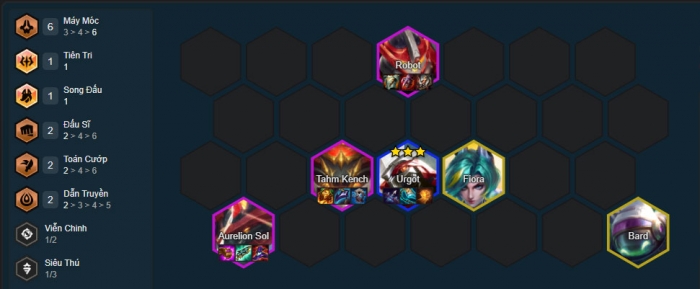 Trang bị tập trung cho Robot (đồ nửa tank nửa đấu sĩ như Thú Tượng, Móng Vuốt, Quyền Năng) và Aurelion Sol (3 món AP). Tahm Kench cầm đồ tank, còn các tướng khác tận dụng đồ dư. Đây là bài đánh tốn tài nguyên, chỉ nên chơi khi có lõi hoặc điều kiện giúp tăng vàng/kinh nghiệm để lên cấp nhanh.
