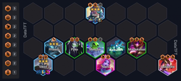 Đầu game không có khung cố định, có thể dùng Thời Không, Siêu Thú hoặc Thượng Cổ để giữ máu và tích kinh tế. Sau đó lên cấp 7 sớm, slow roll theo đội hình gồm Pyke, Illaoi, Rhaast, Mordekaiser, Meepsie, Viktor và Lissandra, ưu tiên nâng Viktor 3 sao trước. Khi hoàn thành, lên cấp 8 và thêm Nami làm carry phụ.
