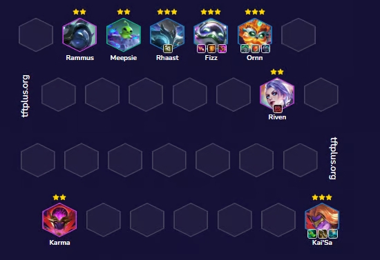 Kai’Sa – Fizz reroll vẫn là đội hình rất mạnh đầu mùa 17 dù đã bị nerf nhẹ, nổi bật nhờ sát thương hỗn hợp, chống chịu tốt và bùng nổ khi dàn tướng 3 vàng đạt 3 sao. Hiệu ứng Vô Pháp giúp đội hình an toàn hơn, nên có thể ưu tiên lên đồ sát thương. Lối chơi là slow roll cấp 7 với khung gồm Fizz, Kai’Sa, Ornn, Rhaast, Karma, Rammus, Gwen, Meepsie; sau đó lên 8 để thêm Riven tăng sát thương.