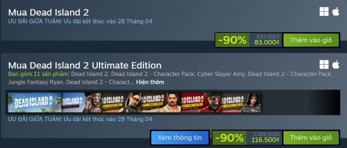 Ở mức giá gốc, Dead Island 2 không phải là tựa game rẻ. Tuy nhiên, với ưu đãi giảm 90% lần này, người chơi chỉ cần bỏ ra khoảng 83.000 đồng để sở hữu phiên bản tiêu chuẩn. Thậm chí, bản đầy đủ nội dung Dead Island 2 Ultimate Edition cũng chỉ nhỉnh hơn đôi chút, nhưng lại đi kèm hàng loạt DLC mở rộng đáng giá.