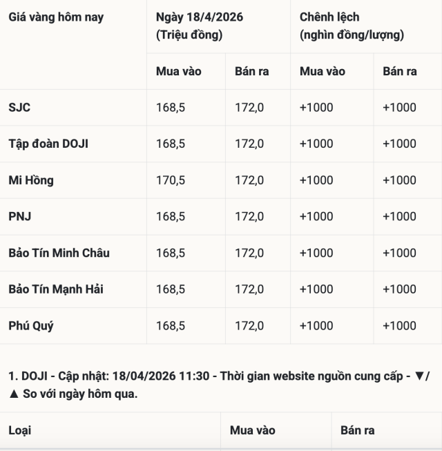 Sau một ngày 17/4 ghi nhận xu hướng giảm sâu tại nhiều đơn vị, giá vàng hôm nay 18/4 (lúc 11h30 ngày 18/4/2026) ghi nhận xu hướng tăng rõ rệt trên toàn thị trường, khi nhiều thương hiệu điều chỉnh đồng loạt 1 triệu đồng/lượng so với phiên trước. Diễn biến này giúp giá vàng hôm nay quay trở lại vùng cao, với vàng SJC tiến sát mốc 172 triệu đồng/lượng. Cụ thể như sau: