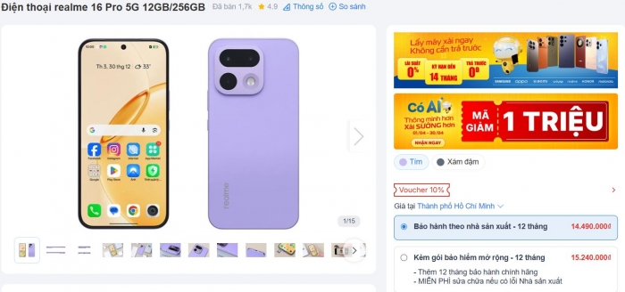 Cả hai phiên bản Realme 16 Pro và Pro 5G đều có mức giá vô cùng phải chăng, thậm chí còn chưa tới 1 chỉ vàng. Cụ thể, bản Realme 16 Pro có mức giá 9.95 triệu đồng còn bản Pro 5G 256GB hiện đang được niêm yết giá 14.49 triệu đồng.