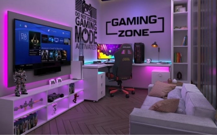 Nếu bạn muốn tạo ra một không gian chơi game hoàn chỉnh, phong cách gaming room sẽ là lựa chọn lý tưởng. Thay vì chỉ tập trung vào việc trang trí góc máy tính, phong cách này hướng đến việc tạo nên một không gian thư giãn, giải trí toàn diện. Bạn có thể sử dụng sofa hoặc giường để ngồi thoải mái, kết hợp với TV hoặc máy chiếu để tạo thành màn hình chơi game lớn cùng với đó là những thiết bị chơi game console như PlayStation hay Xbox, mang lại trải nghiệm đắm chìm hơn. Không gian rộng rãi và thoải mái này không chỉ giúp bạn thư giãn sau những giờ làm việc căng thẳng mà còn tạo ra một phòng chơi game đẳng cấp, lý tưởng để tận hưởng những giờ phút giải trí tuyệt vời.