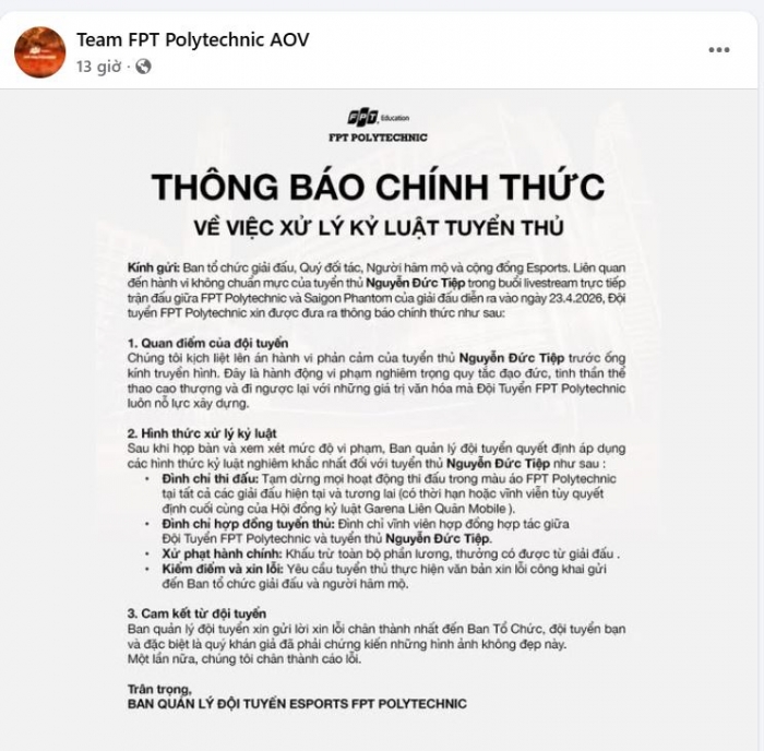 Đáng chú ý, đội tuyển đưa ra hàng loạt hình thức xử lý kỷ luật hết sức nghiêm khắc. Cụ thể, tuyển thủ này bị đình chỉ thi đấu, tạm dừng mọi hoạt động trong màu áo FPT Polytechnic tại các giải đấu hiện tại và tương lai, chờ quyết định cuối cùng từ hội đồng kỷ luật. Bên cạnh đó, hợp đồng hợp tác giữa đôi bên cũng bị đình chỉ vĩnh viễn.