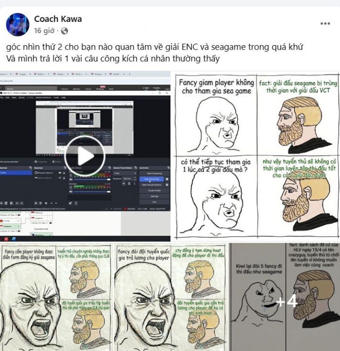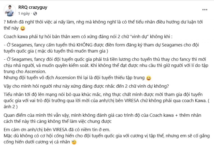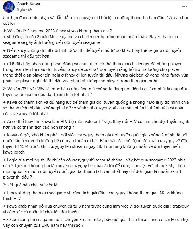 Chưa dừng lại ở đó, HLV ĐTQG Việt Nam bộ môn Valorant tiếp tục lên thêm một bài viết nữa vào cuối ngày. HLV Kawa chốt lại vấn đề của Fancy trong đợt SEA Games 32, khẳng định bản thân sẵn sàng bỏ qua câu chuyện của 3 năm trước để có thể toàn tâm toàn ý giúp đội tuyển Việt Nam tại giải đấu lần này nhưng phía crazyguy lại để cảm xúc cá nhân chi phối và từ chối tham gia đội tuyển.