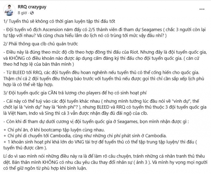Trong bài đăng mới nhất, thuyền trưởng tuyển Valorant Việt Nam khẳng định việc FCY không dự SEA Games là lý do bất khả kháng do trùng lịch thi đấu, không thể xé lẻ đội hình cho nhiều đấu trường. Việc yêu cầu được trả lương cũng bắt buộc vì công ty phải dừng hoạt động.