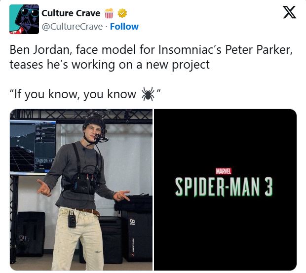 Trong một bài đăng trên Instagram (hiện đã bị xóa), Ben Jordan – diễn viên diễn hoạt khuôn mặt của nhân vật Spider-Man trong game – đã chia sẻ một bức ảnh anh thực hiện các hoạt động motion capture kèm dòng trạng thái “If you know you know” (ai biết thì sẽ hiểu) cùng biểu tượng con nhện.