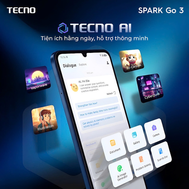 TECNO chính thức trình làng SPARK Go 3 tại thị trường Việt Nam. Định vị là dòng sản phẩm hướng đến giới trẻ, SPARK Go sử dụng đồng nhất ngôn ngữ thiết kế sáng tạo, hiệu năng bền bỉ. Ở phiên bản Spark Go 3, sản phẩm có dung lượng Pin lớn 5000mAh, tần số quét 120Hz, chuẩn kháng nước bụi IP64 cùng loạt tính năng TECNO AI, đáp ứng tốt các nhu cầu giải trí, học tập, làm việc cơ bản.